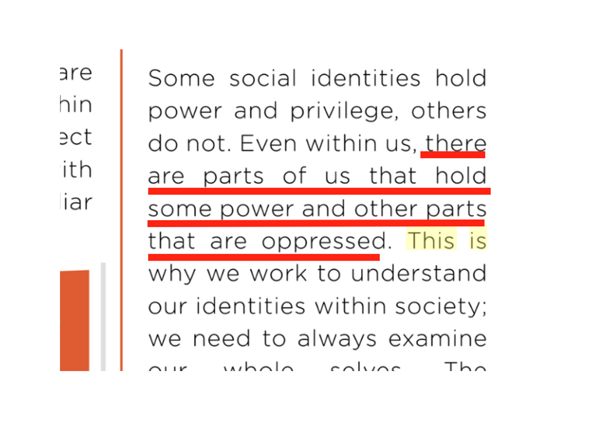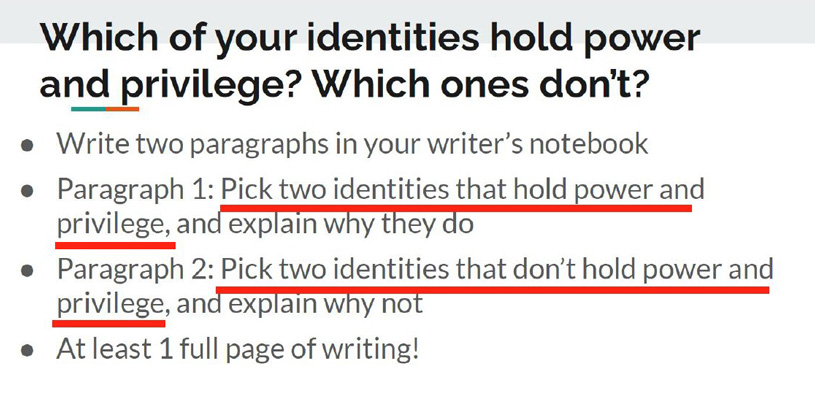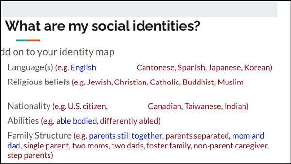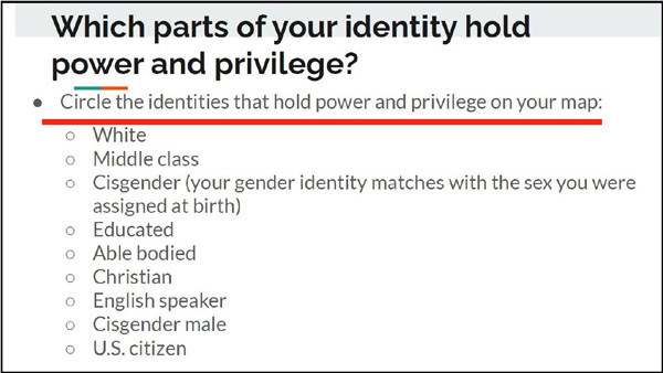 El test para los estudiantes les pide definir su idioma, religión, nacionalidad, género, habilidades y estructura familiar, y luego pregunta qué parte de esa identidad tiene más “poder y privilegio”.